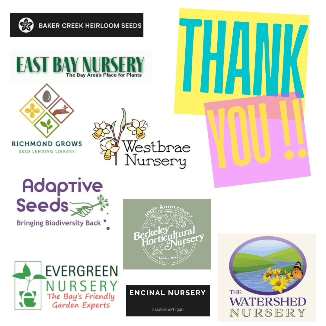 Richmond Grows Seed Lending Library • The Watershed Nursery Cooperative • Berkeley Horticultural Nursery • Baker Creek Heirloom Seeds • Adaptive Seeds • Westbrae Nursery • Encinal Nursery • Evergreen Nursery • East Bay Nursery